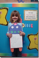 One of our favorite projects was done after reading the book Space Case by Edward Marshall. This story is about a space “thing” that comes down to Earth and gets to go trick or treating and go to school. I had the students write about what it would be like to have a “space thing” visit them here on Earth. In their stories they had to name their Space friend, tell where it came from, why did it come down to Earth, what would it do on Earth, and tell if their space friend would stay on Earth or would it leave and why. They were very creative! These are our “Space Friends”!