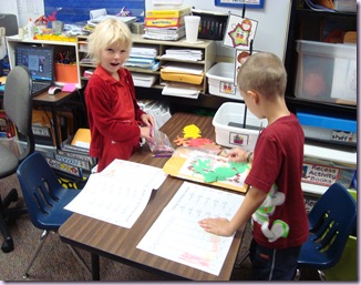 At this center they played a memory game matching pictures with the same beginning sounds. At the listening center they listened to Clifford’s First Fall and then played a game called “Leaf Blower” with vocabulary words on the cards. If they got the word right they got to keep the cards, but if they got the “leaf blower” they had to put all their cards back in the pile.