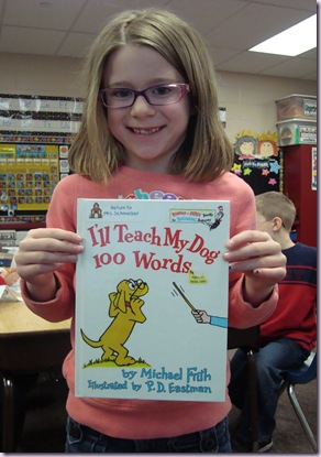 We finished up the day with the book I’ll Teach My Dog 100 Words. We then created our own books with 100 words that we can read and write. We did it in sets of ten. We wrote 10 color words, 10 number words, 10 action words, 10 more action words, 10 things we can wear, 10 names for people, 10 foods, 10 animals, 10 word wall words, and 10 friend’s names.