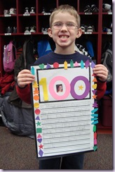 We had a fun day on January 31 celebrating our 100th day of school…finally after 2 snow days! We spent the whole day integrating the number 100 into our lessons. We started the day off coloring 100 items by a code and then adding up the items to see if it =100.